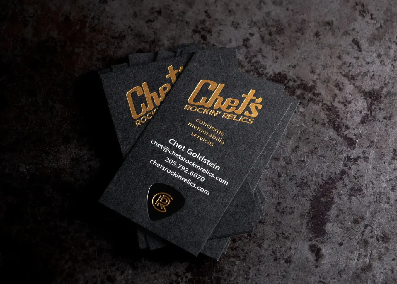 When Chet came to us to print business cards, we wanted them to reflect his world of rare rock and country music memorabilia. As the founder of Chet's Rockin' Relics, he tracks down everything from autographed guitars to stage-worn boots.